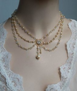 Як вже говорилося вище, краще доповнення образу з білим весільним платтям в античному стилі – це золото. Розкішні золоті прикраси – масивні, великі сережки, намиста, кольє або елегантні і витончені підвіски, браслети і кільця – тут більш ніж виправдані. Однак нареченій не варто надягати на себе всі наявні в скриньці коштовності разом (наприклад, величезні сережки з розкішним кольє), щоб не перевантажити образ і не виглядати без смаку. Краще зупинити свій вибір на чомусь одному: або на намисто, або на сережках з великими каменями.