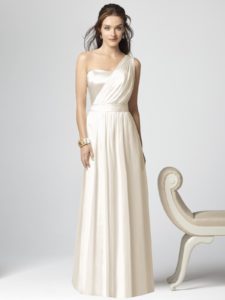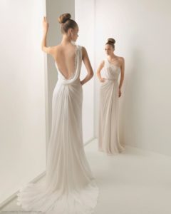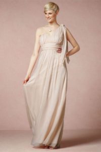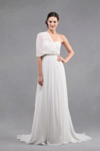Дуже стильно і витончено виглядають грецькі весільні сукні з драпірованими бретелями, асиметричним верхи, проймою на одне плече: