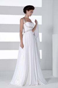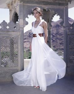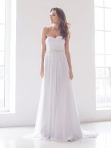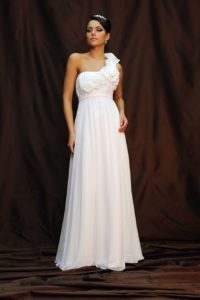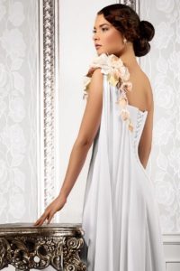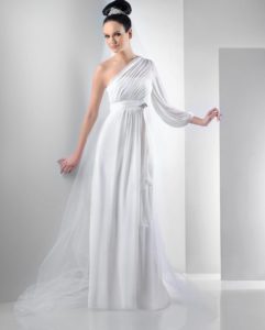 Фото грецького весільного плаття з поясом і проймою на одне плече: