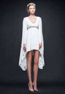Довжина максі – не єдиний доступний варіант. Існують дуже стильні короткі весільні сукні у грецькому стилі. Якщо вбрана в легку довгу сукню наречена схожа на Геру або Афіну, то вишукана сукня-міні надає дівчині схожість з чарівною і пустотливий Артемідою.