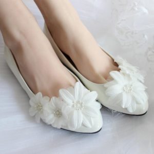 Класичні білосніжні човники, витончені балетки або туфлі на невеликому каблучку, прикрашені стразами, перлами, квітами або бантиками, мережаний вишивкою – кращий вибір для наречених.