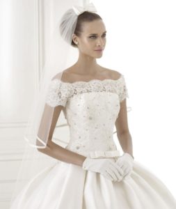 Весільну сукню з відкритими плечима і мереживними короткими рукавами: