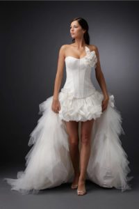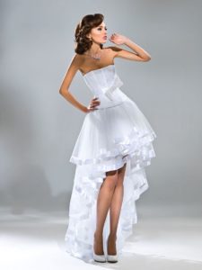 Укорочені спереду весільні сукні зі шлейфом підійдуть для нетривіальних осіб, люблячих модні і незвичайні наряди.