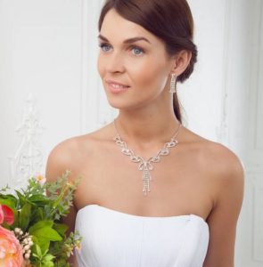 Якщо корсет має лаконічний дизайн, припустимо надіти розкішне кольє, широкий багато прикрашений браслет або сережки з камінням. Підійдуть такі прикраси і під весільну сукню з відкритим корсетом, глибоким декольте або вирізом, оголює шию і плечі.