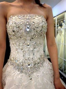Стрази, як один з найбільш доступних елементів декору, часто використовуються для прикраси корсета весільного плаття, зробленого своїми руками: