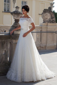 Мереживне весільне плаття А-силуету з рукавами – хороший варіант для міжсезоння, з відкритими плечима – для спекотного літа.
