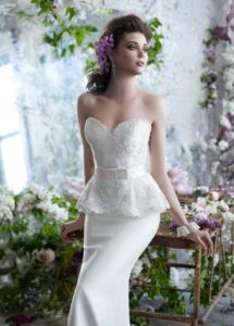 Мереживні весільні сукні по фігурі дизайнери часом доповнюють баскою, що візуально стрункішою наречену.