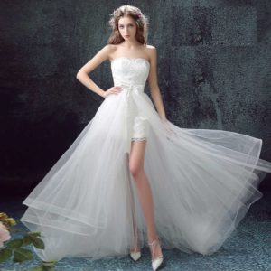 Дана категорія – своєрідний компроміс, спосіб примирити красу об’ємного низу з хоча б мінімальним комфортом для дівчини. Сукні з недовгим «хвостом» демократичніші, легше вписуються в різні святкові та стилістичні концепції, сценарії та обставини.