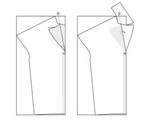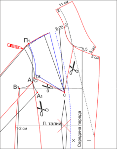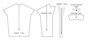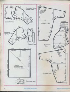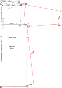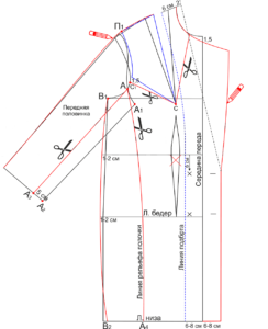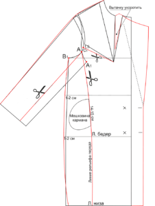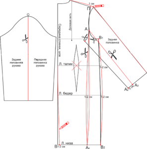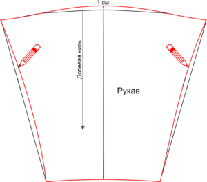 Для побудови викрійки спущеного рукава на кальку потрібно перенести готові частини, вже змодельовані на спині і поличці, склавши їх разом по верхньому шву. Окат при цьому слід підняти на 1 см, а по ширині рукав скоротити на 3 см (з двох сторін по 15 мм).
