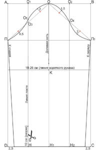 - для побудови лінії оката рукава т. П, Про, П1 з’єднують пунктирною лінією, відрізки ПО3, О3О, ОО4, О4П1 поділяють навпіл, від їх середини відкладають 5 мм – вниз, вгору, вгору і вниз.