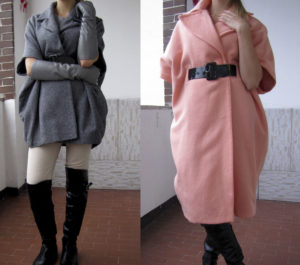 Щоб зшити стильну накидку-кокон, знадобиться шматок м’якої вовняної тканини розміром 3,5х1,45 м. Спинку, обидві полички і рукава викроюють з припусками 1,5 см, внизу на подвороты залишають 4 див.