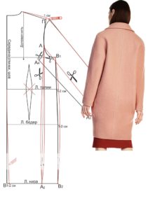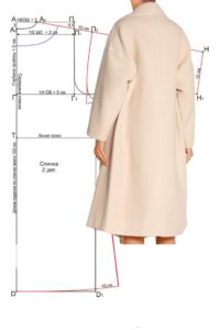 Для створення викрійки полички жіночого пальто оверсайз зі спущеним плечем за основу беруть вже намальовану спинку. Поличку злегка піднімають згідно з міркою ДТП: вгору від талії відкладають відрізок ТА = ДТП+1 см (З). Плече піднімають на 2,5 см відкладають від т. П1, звідки проводять лінію плеча, що переходить в рукав.