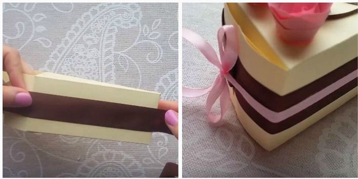 3. Переходимо до прикраси. Посередині коробочки клеїмо коричневу стрічку на двосторонній скотч. На неї вузьку рожеву стрічку і зав’язуємо у вигляді бантика.