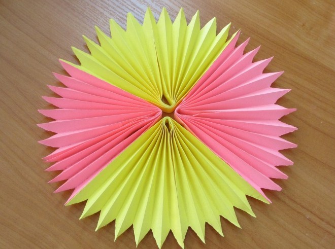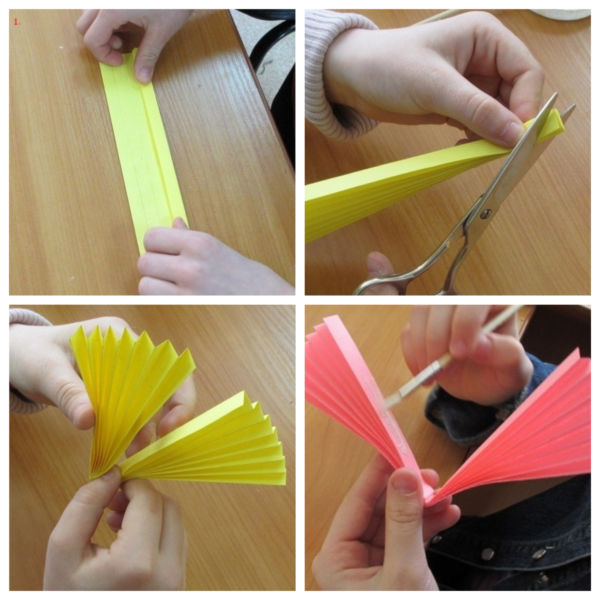 3. Кожну заготовку (віяло) складаємо навпіл, по краях промазуємо клеєм і склеюємо. Долно у нас вийти 4 деталі 2 рожевого і 2 жовтого кольору.