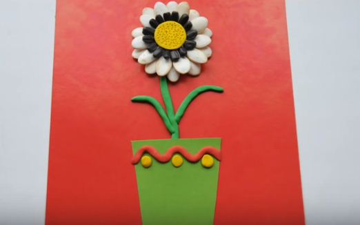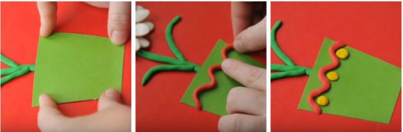 6. З картону зеленого кольору вирізаємо горщик. Приклеюємо його поверх стебла. З червоного пластиліну катаємо тонку ковбаску і прикрашаємо їй верх горщика у вигляді хвилі. Під нею розміщуємо 3 жовтих гуртка з пластиліну.