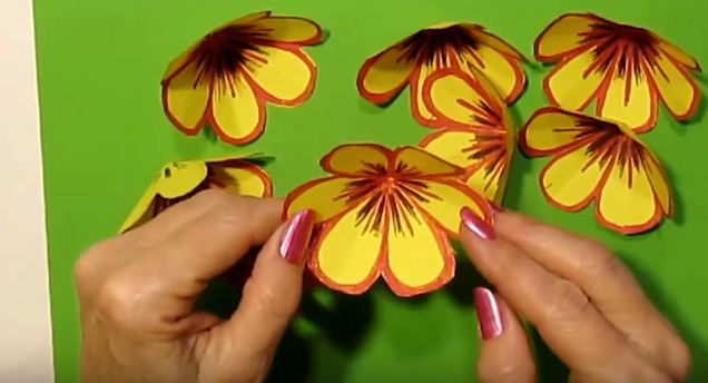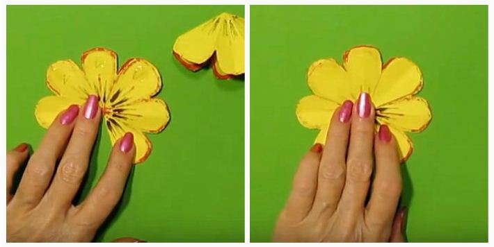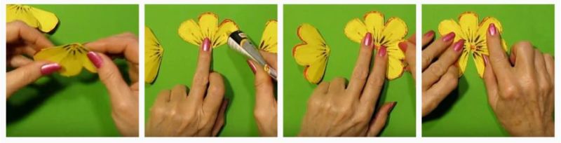 8. Отримані квіти згинаємо навпіл. Тепер нам потрібно зібрати їх в красивий букет. За бічні пелюстки приклеюємо до одній квітці два, з обох сторін.