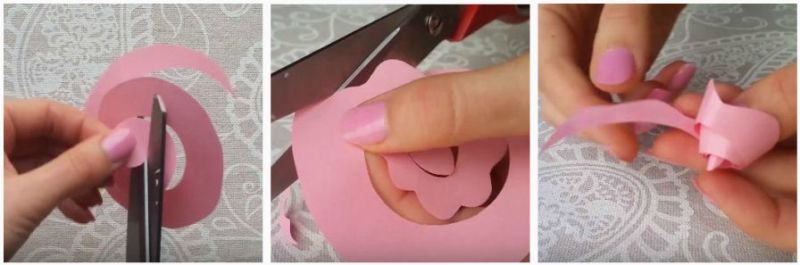 4. Для квітки вирізаємо гурток рожевого кольору. Починаємо розрізати його по спіралі від краю до середини. Тепер зробимо краю хвилястими і скрутимо спіраль в бутончик. Кінчик паперу закріпимо клеєм.