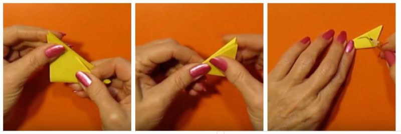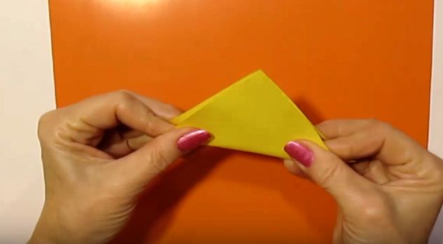 1. З жовтого паперу виріжемо 7 квадратів. Їх розмір 9 на 9 сантиметрів. Беремо один квадрат і починаємо робити з нього квіточку. Спочатку зігнемо його по діагоналі. Виходить ось такий трикутник.