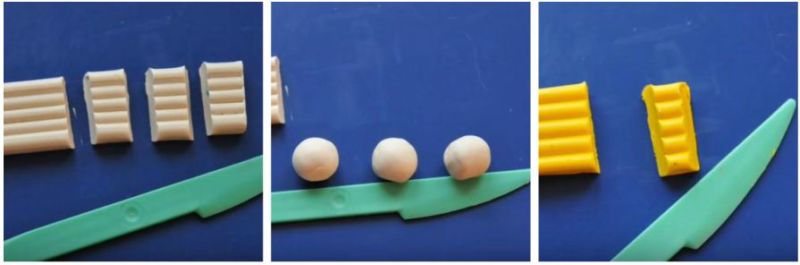 1. Відокремлюємо від пластиліну білого кольору 3 однакових шматочка і скачуємо їх у кульки. З пластиліну жовтого кольору відрізаємо такий же цеглинка. Також робимо з нього кульку. В результаті у нас виходить 3 білих кульки і 1 жовтий. Всі однакового розміру.