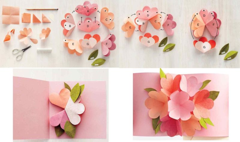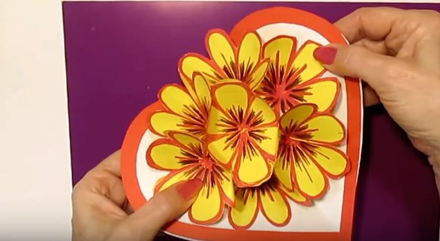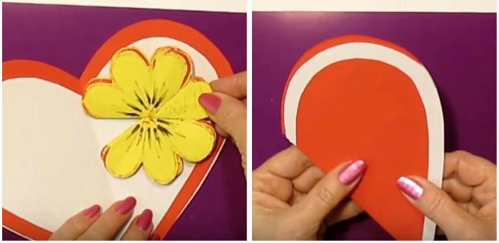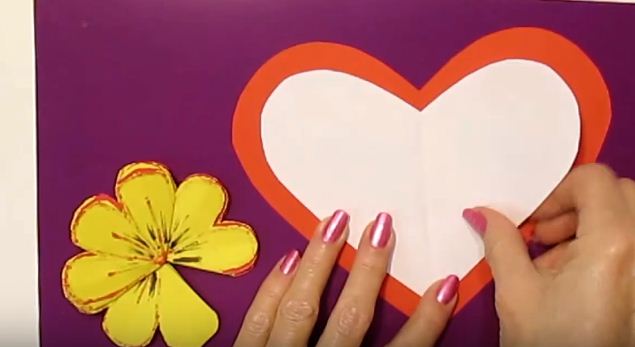 14. Тепер приклеюємо букет за допомогою верхнього пелюстки до однієї сторони серця. Таким же чином приклеюємо букет до другій стороні листівки.