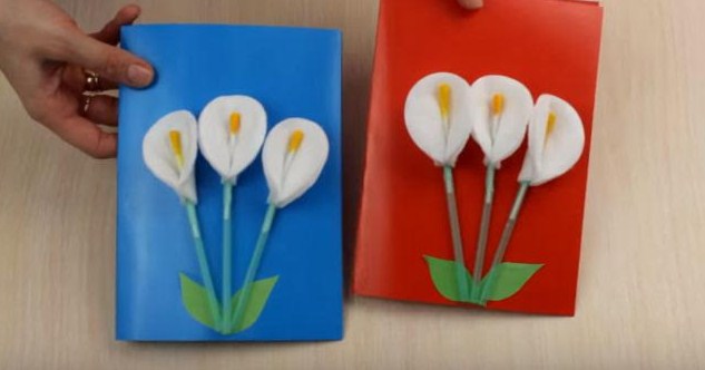 Тепер залишилося приклеїти квітка на кольоровий картон і зробити стебло і листівка готова!