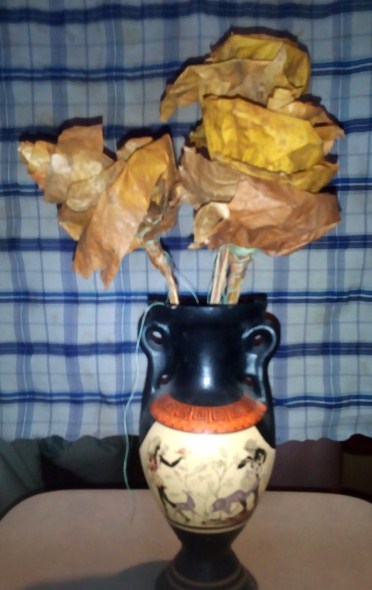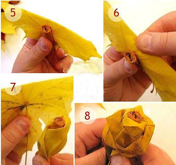 А можна такі трояндочки з осіннього листя зробити на паличці і поставити у вазу, дуже цікаво виглядає!