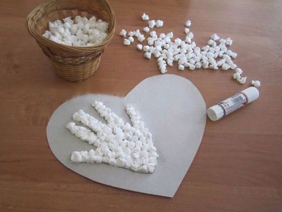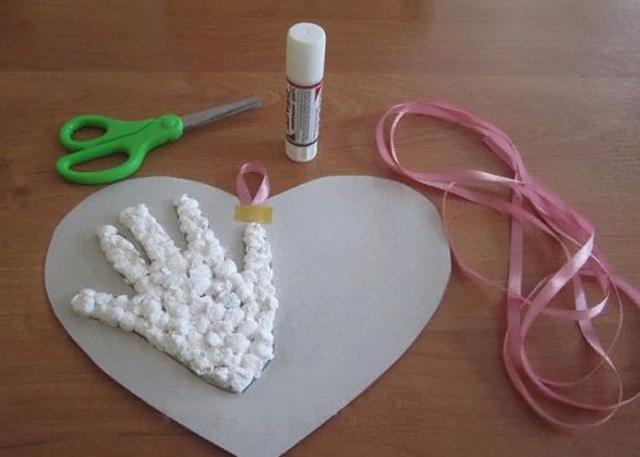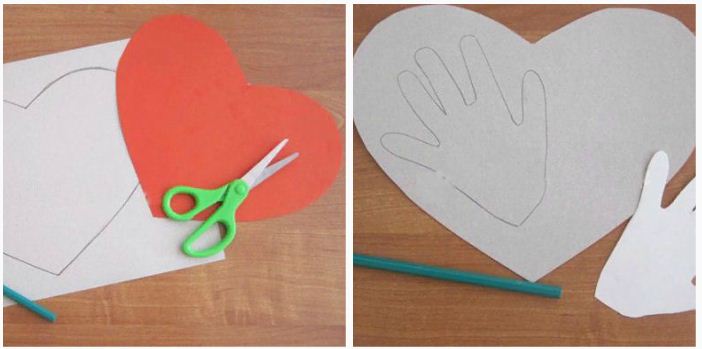 1. На картоні малюємо серце і акуратно вирізаємо його. Перевертаємо заготівлю білою стороною, обводимо на ній шаблон дитячої руки. Також можна обвести просто долоню дитини.