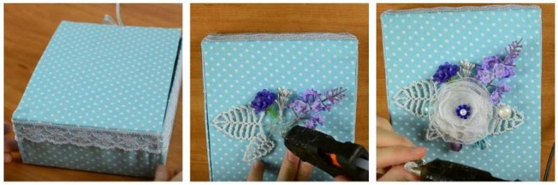 5. Бічну частину коробки прикрасимо мереживною стрічкою. А верх різними декоративними квітами та ягодами.