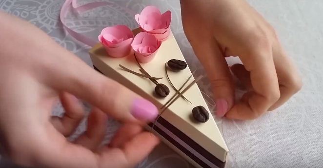 5. Робимо таким чином ще 2 трояндочки і прикрашаємо ними коробку-торт. Також ми додали для краси зерна кави, які приклеїли на гарячий клей. І пелюстки декоративної трави.