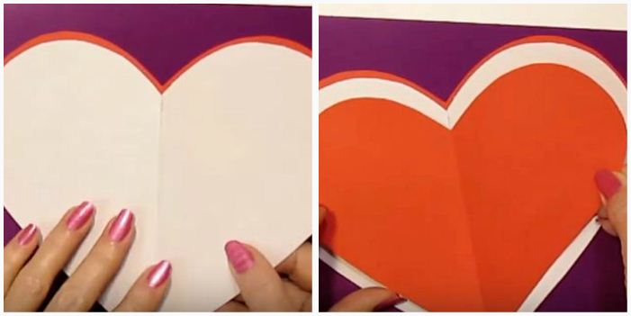 13. З іншого боку до червоного серця приклеїмо біле, майже такого ж розміру. А на нього ще одне червоне поменше. Згинаємо по середині. В результаті у нас вийшла листівка з чотирьох сердець. Всередині вона біла, а з зовнішньої сторони червона.