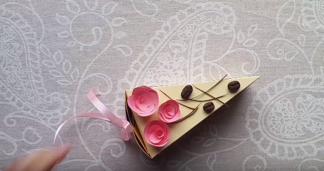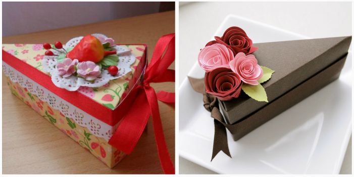 Апетитний шматочок торта, наповнений цукерками чи побажаннями для коханої матусі. Така саморобка не займе багато часу, але зате як оригінально буде виглядати.