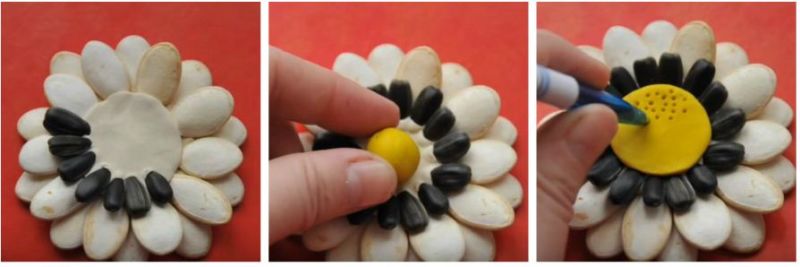 4. Закріплюємо третім шаром білого пластиліну. Поверх нього викладаємо соняшникове насіння. А з жовтого пластилінового кульки робимо серцевину квітки. Ручкою протикаємо на ній поглиблення.