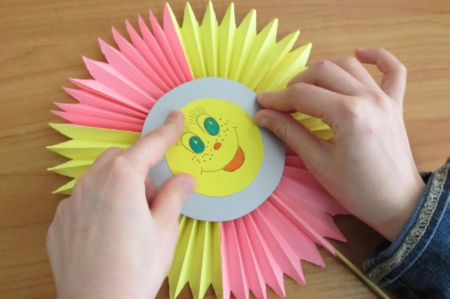 6. Далі вирізаємо жовтий кружечок і малюємо веселу і усміхнену мордочку. Яку потрібно приклеїти по серединці нашого сонечка.