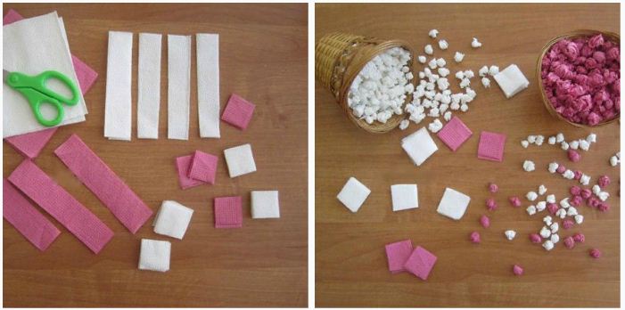 2. Білі і рожеві серветки нарізаємо на квадрати 3 на 3 сантиметри. Кожен скачуємо в кулю, не сильно натискаючи на папір. Інакше кругляшек стане жорстким.