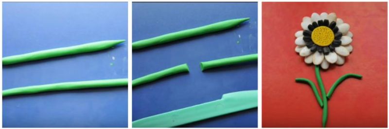 5. З зеленого пластиліну скручуємо 2 ковбаски для стебла. Одну з них розрізаємо навпіл. Тепер розміщуємо їх на аплікації і злегка притискаємо до картону.