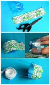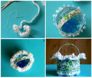 З тканини вирізують прямокутник, ширина якого повинна бути дорівнює висоті кошики, а довжина її кола. Потім змащують пластмасову основу клеєм і приклеюють отриманий прямокутник тканини.