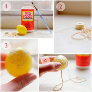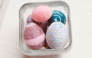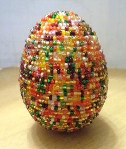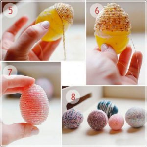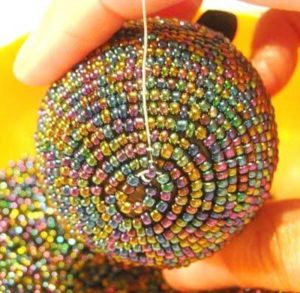 Спочатку на волосінь нанизують бісер, щоб вийшла довга ланцюжок. Після рясно змащують заготовку у вигляді яйця клеєм і починають обклеювати отриманої ланцюжком з бісеру заготівлю зверху.