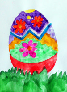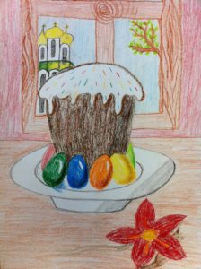 Старші діти вже намагаються вибирати ідеї для малюнків трохи складніше, наприклад, у вигляді натюрморту з великодньою паскою і барвистими яйцями навколо.