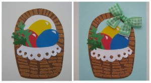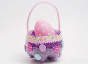 Елементи у вигляді яєць приклеюють так, щоб їх нижня частина була розташована під мереживним елементом кошики. Так, буде створено ефект наповненою кошика. За бажанням додають декор.
