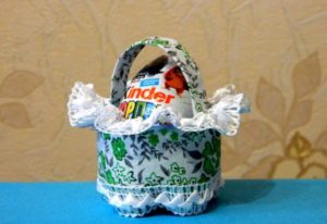 З тієї ж тканини вирізують ще 2 смуги по 1 см в ширину і 15 см в довжину. Змащують клеєм ручки кошика, з’єднують їх посередині і починають спіралеподібними рухами обклеювати їх смужками тканини.