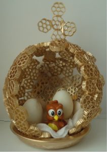 Великодні вироби в школу в 2-му класі можна виконати своїми руками з макаронів. Таку саморобку можна робити дітям повністю самостійно, але от використовувати аерозольну фарбу слід тільки дорослим. Можна її і зовсім не застосовувати, а замінити кольоровий гуашшю або інший безпечною фарбою.