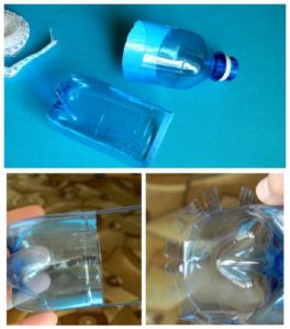 Спочатку роблять основу майбутньої великоднього кошика. Для цього розрізають пляшку так, щоб від її дна до розрізу було 15 см (5 см глибина кошики і 10 см на ручку). Вирізують ручки, ширину краще зробити 1 див. Після край підстави надрізають і відгинають.