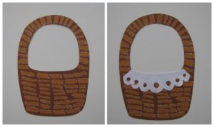 Потім необхідно нарвати з кольорового паперу невеликі смужки. Їх наклеюють на лицьову сторону кошики. Також виконують декоративний елемент з білого аркуша паперу у вигляді мережива, приклеюють його.