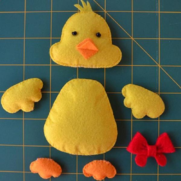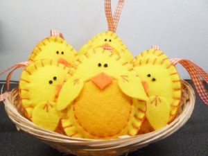 Для цього необхідно вирізати з фетру кожну частину курчати і бантик. Набити синтепоном і потім зшити все, щоб вийшла фігурка курчати на Великдень. Великодній виріб в садок з солоного тіста