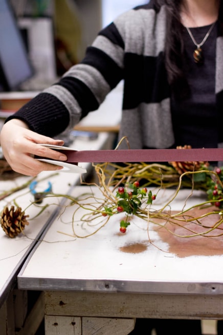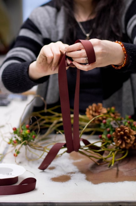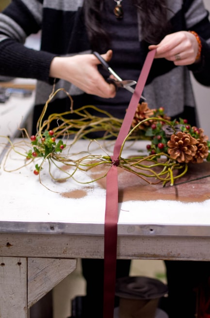 Обмотуємо вінок стрічкою і зав’язуємо вузол. Відрізаємо кінці, щоб вони трохи звисали.