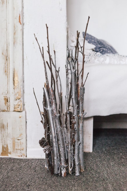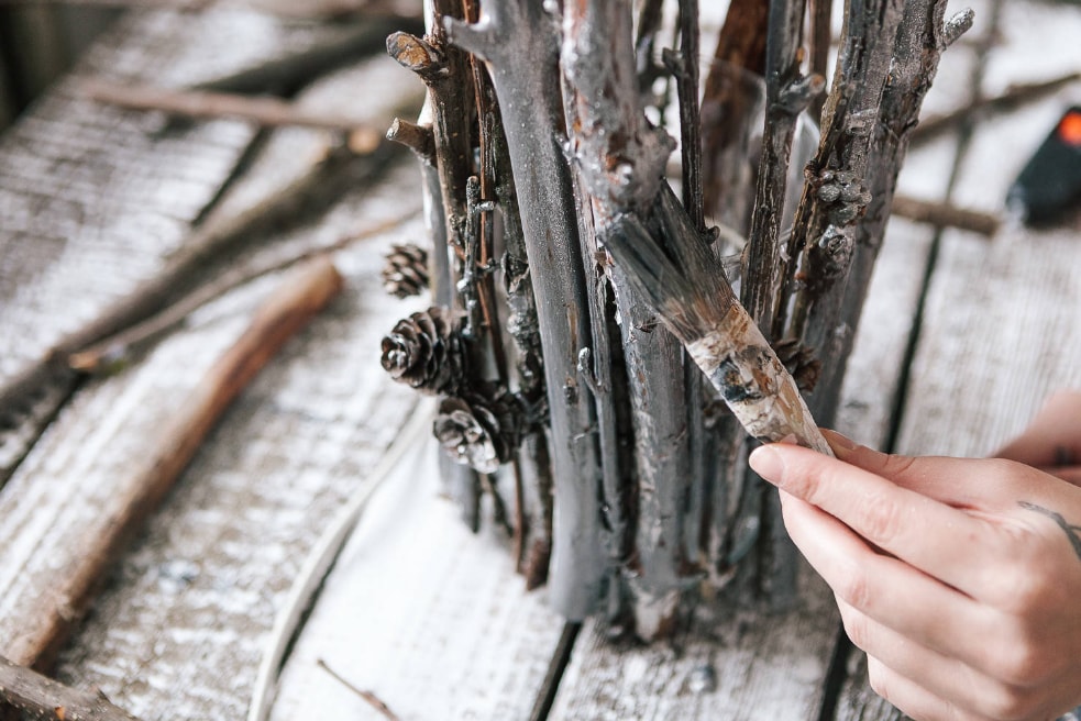 Якщо ви плануєте використовувати його в зимовий час року, то краще пофарбувати гілочки і шишки сріблястою фарбою, а також прикрасити різними блискітками.