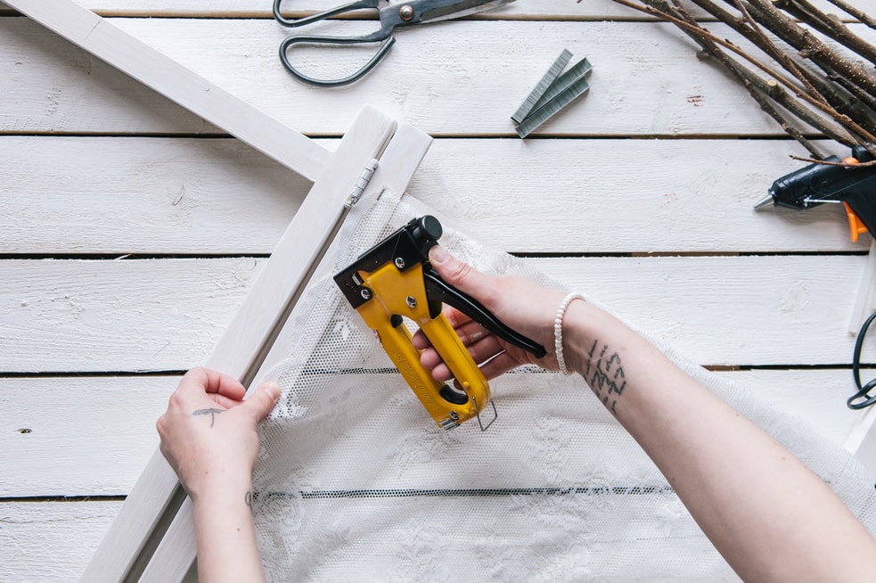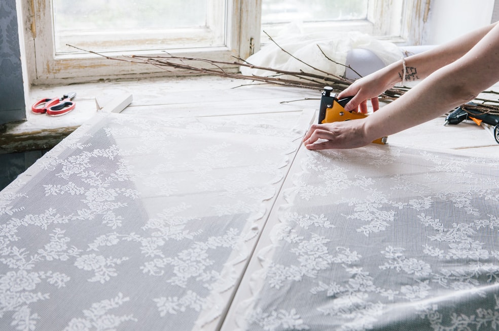 За допомогою степлера фіксуємо відрізок тканини на ширмі. Дуже важливо її натягувати, щоб вона не провисала.