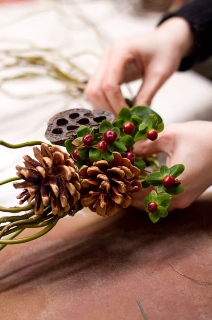 Додаємо в композицію гілочки звіробою і насіннєві коробочки лотоса.