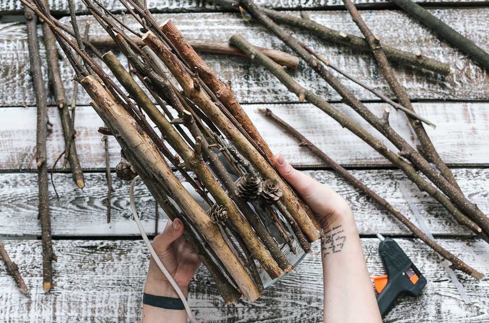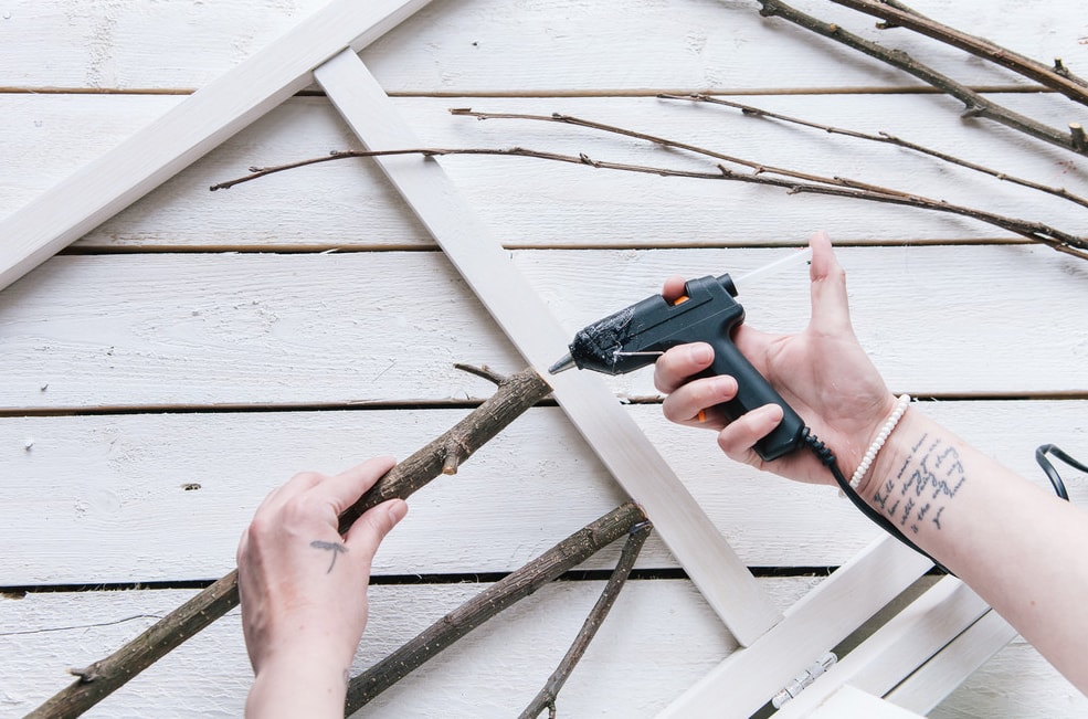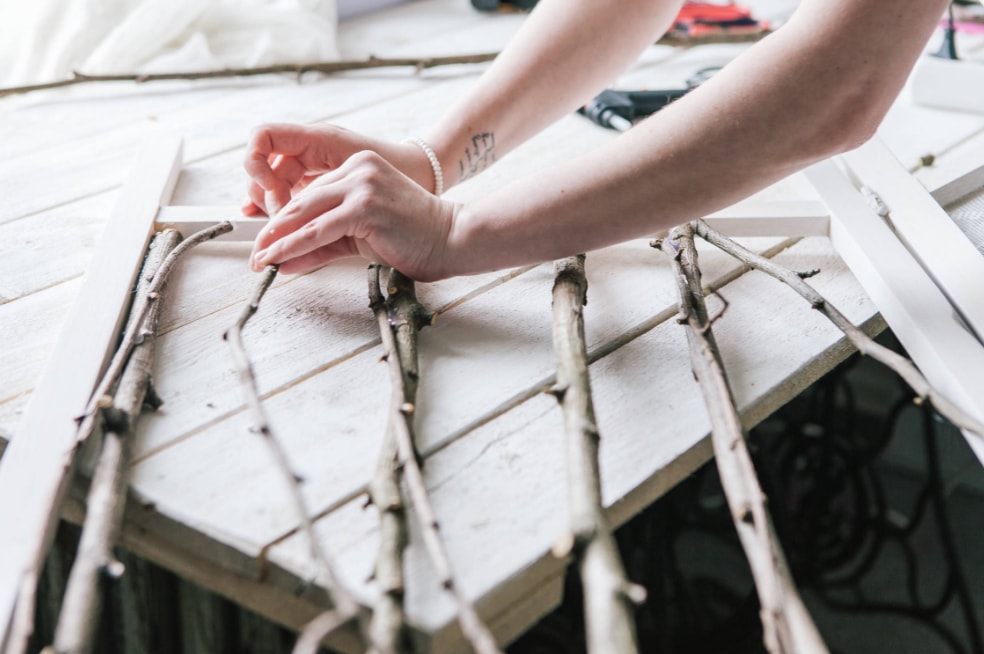 Прикріплюємо гілки до дерев’яної рами з допомогою клею-пістолета.