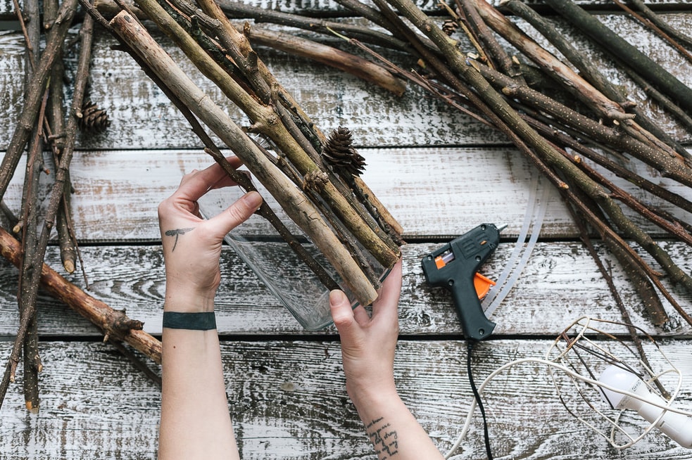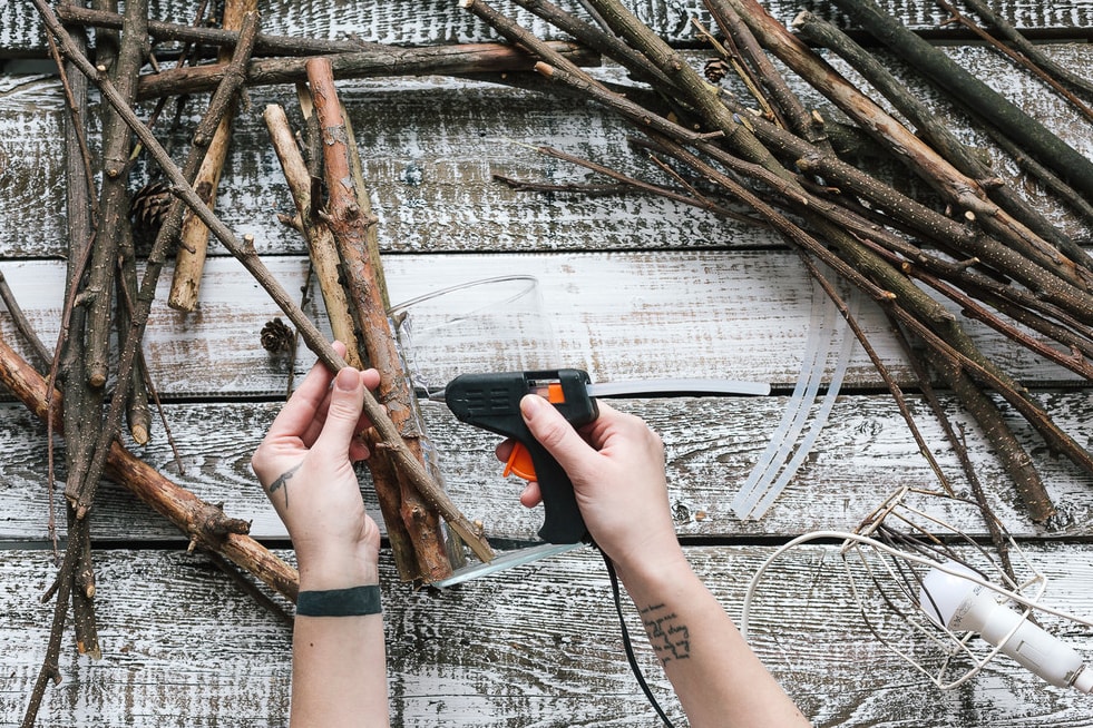 Для початку обробляємо поверхню вази спиртом. Тільки після цього акуратно приклеюємо гілки до вази з допомогою гарячого клею-пістолета.